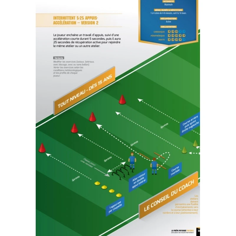 Bien que le football ne soit pas qu’une activité athlétique, le staff technique doit essayer de proposer différentes formes d’exercices intermittents : avec ou sans ballon, pour l’ensemble du groupe ou pour un groupe de joueurs restreint, spécifique au poste, incluant de la motricité, en phase de réathlétisation,en pré-saison…