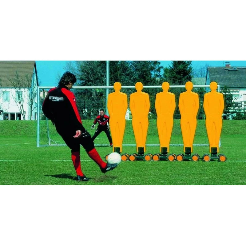 Mannequin d’entrainement football jaune en plastique renforcé antichoc sur chariot 4 roues.