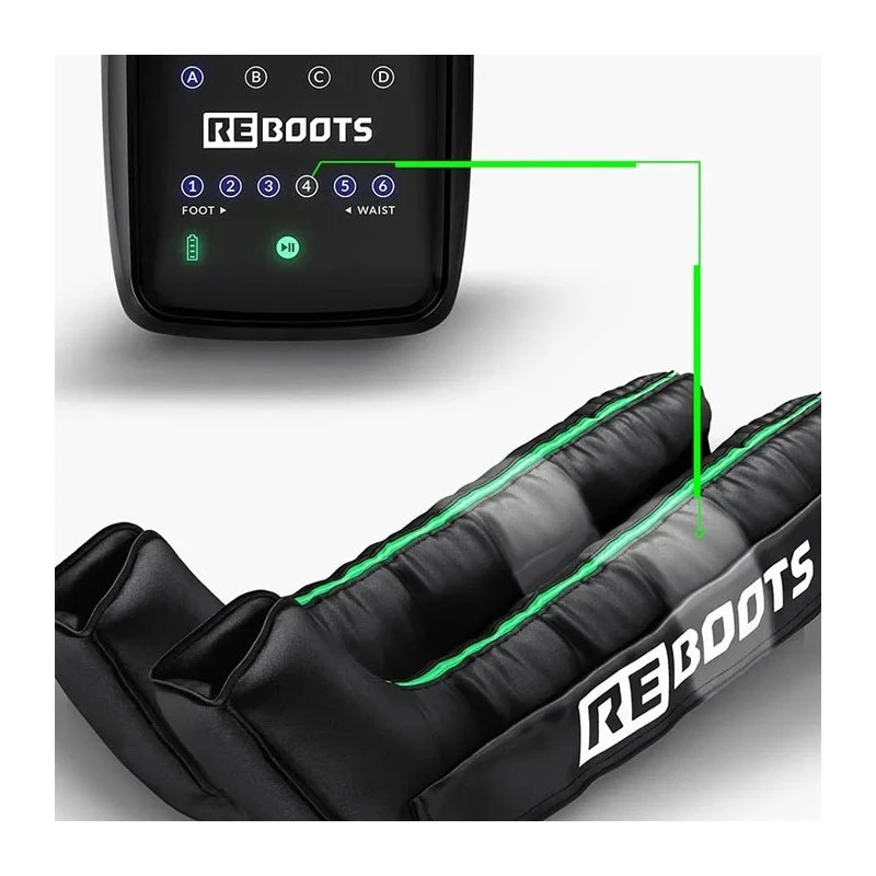 Les bottes de récupération Reboots GO ont été conçues spécifiquement pour offrir une récupération complète des jambes, où que vous soyez. Elles sont connectées à un boîtier de commande central qui assure une compression puissante dans les 6 chambres gonflables superposées de la botte, garantissant une répartition de la pression fluide et efficace.